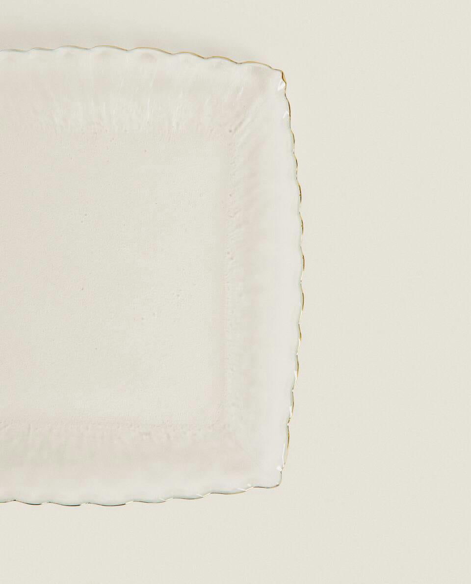Plato de postre cuadrado de cristal con borde festoneado y borde dorado, para Navidad.