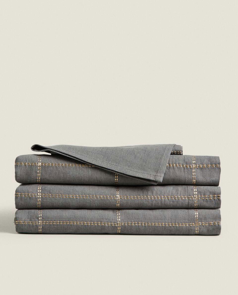 Mantel navideño de lino con detalle de cadena bordada en contraste.