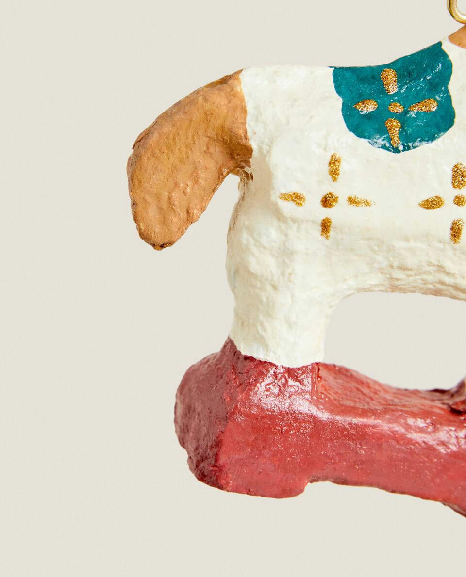 Adorno para árbol de Navidad hecho en papel maché con forma de caballo balancín.