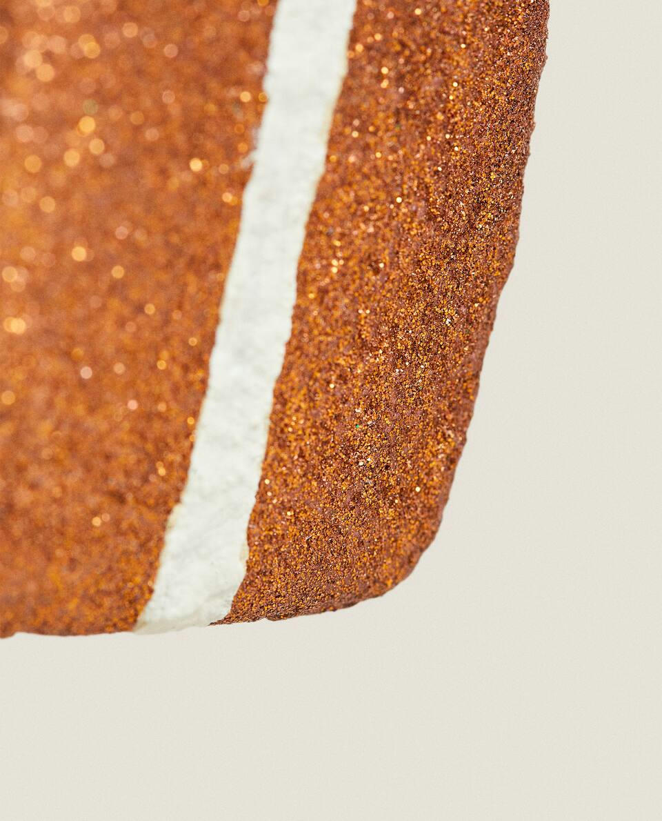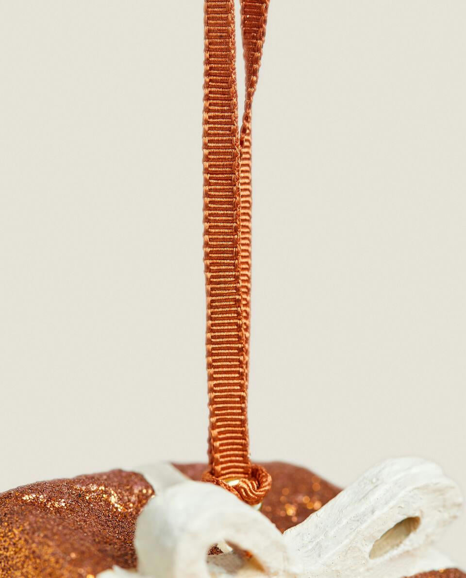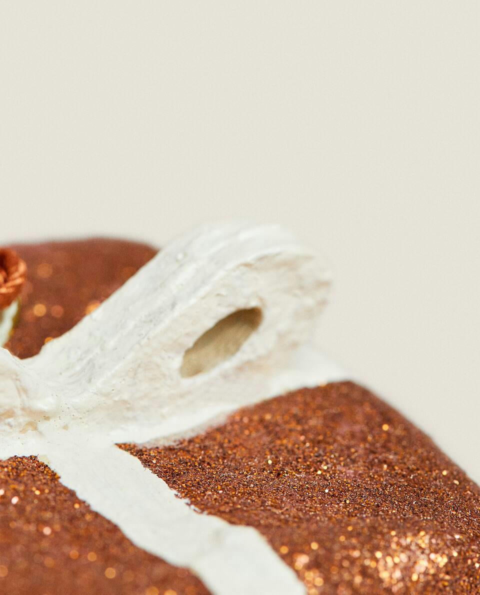 Adorno para árbol de Navidad, realizado en papel maché con forma de regalo, con cinta de terciopelo para colgar.