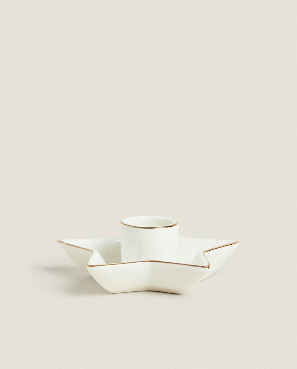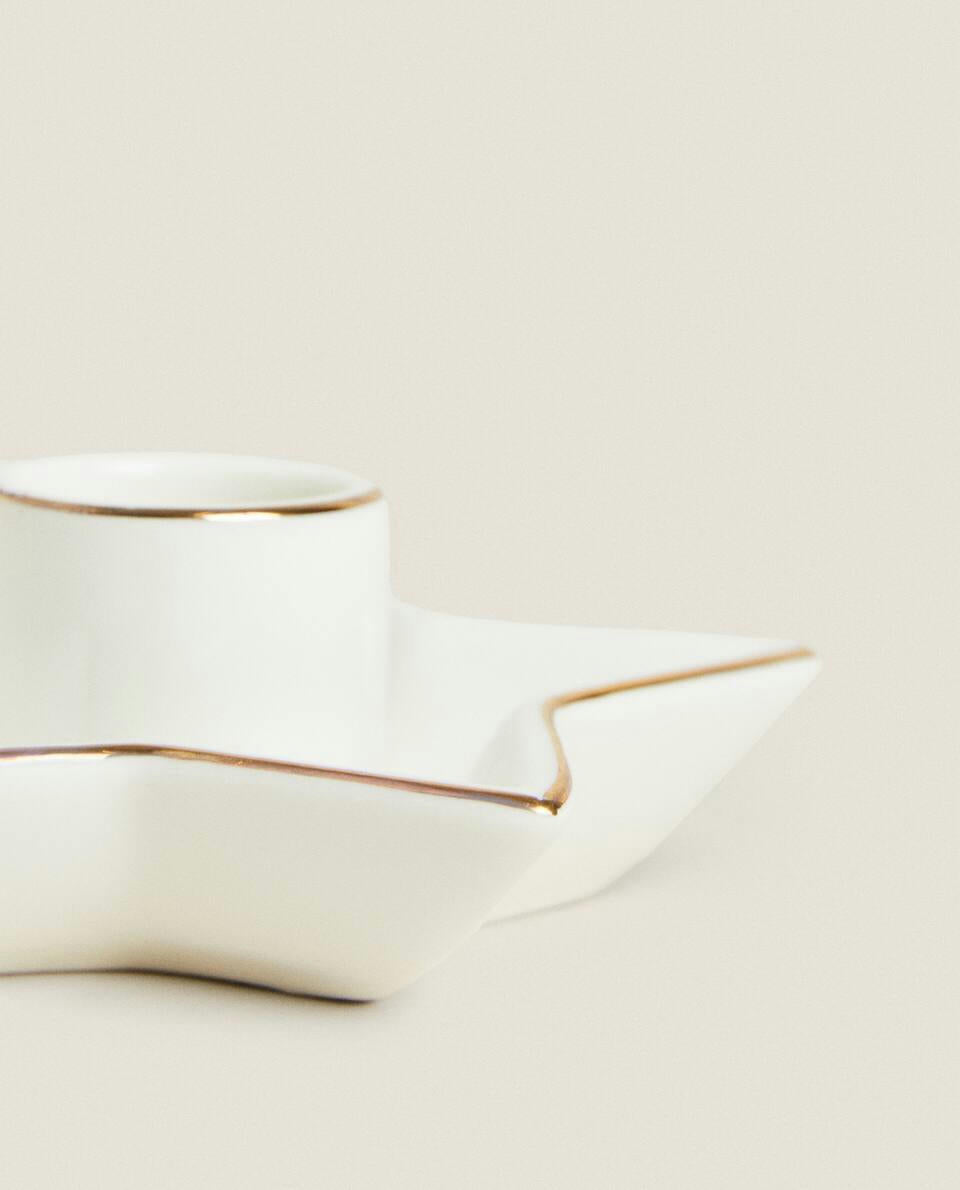 Candelabro de porcelana, con base en forma de estrella y borde dorado, para Navidad.