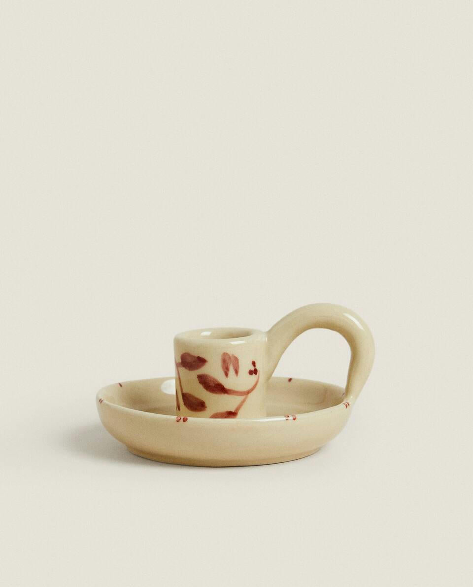 Candelabro de cerámica con asa y base redonda con detalles pintados, para navidad.
