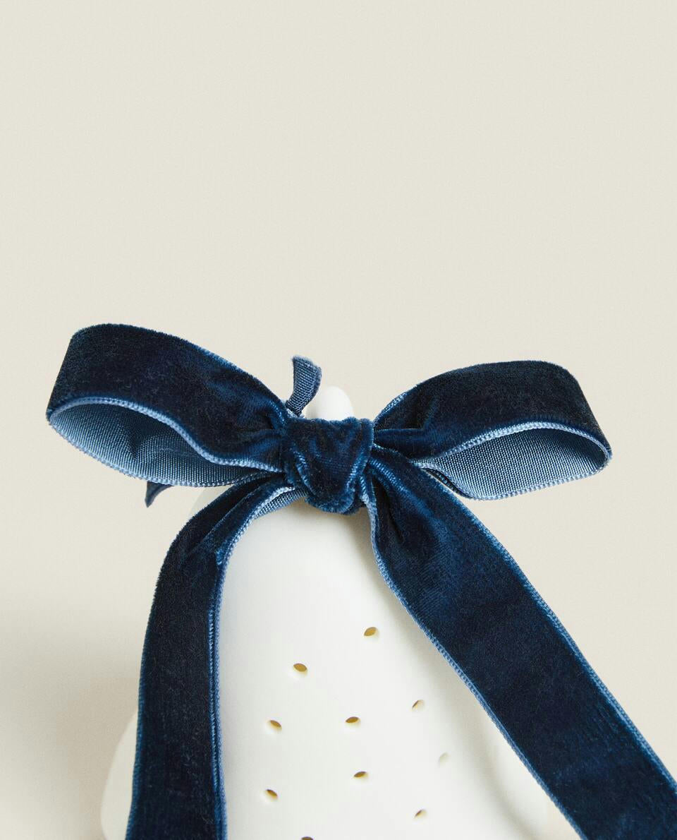 Adorno de campana navideña con luz y detalle de lazo de terciopelo en la parte superior.Pilas incluidas.