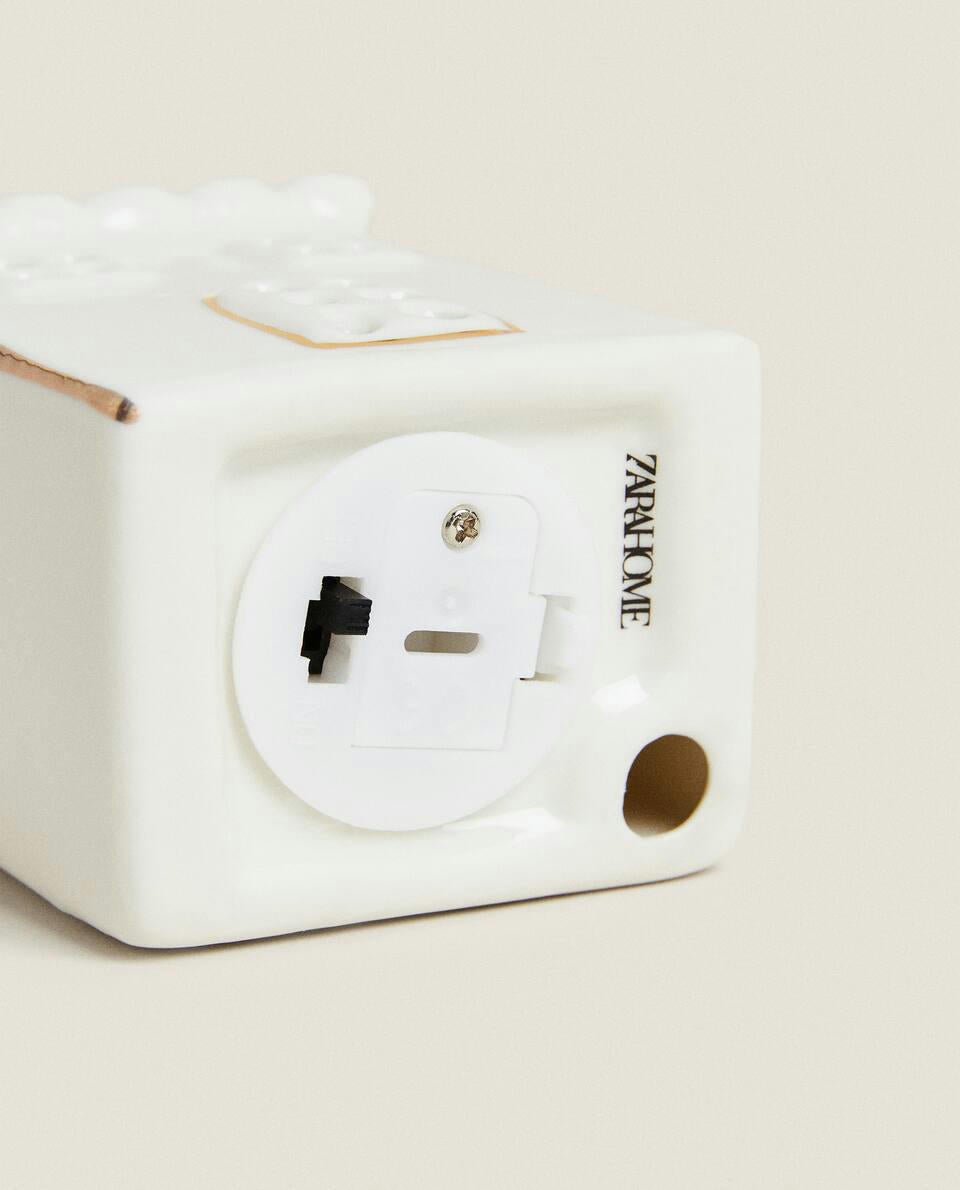 Adorno navideño de cerámica en forma de casa con luz.