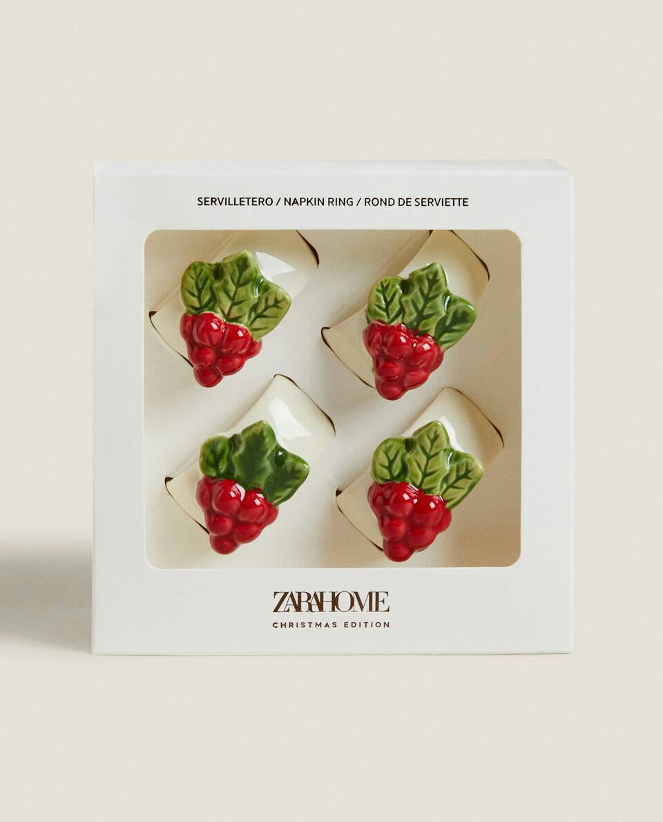 Portatovaglioli in ceramica con dettaglio di vischio, per Natale.Confezione da 4.
