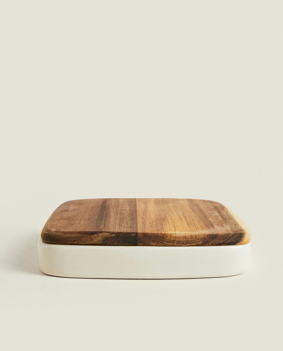Set di coltelli per formaggio in acciaio inox con manici in gres.Il set è contenuto in un contenitore in gres con coperchio scorrevole in legno di acacia.