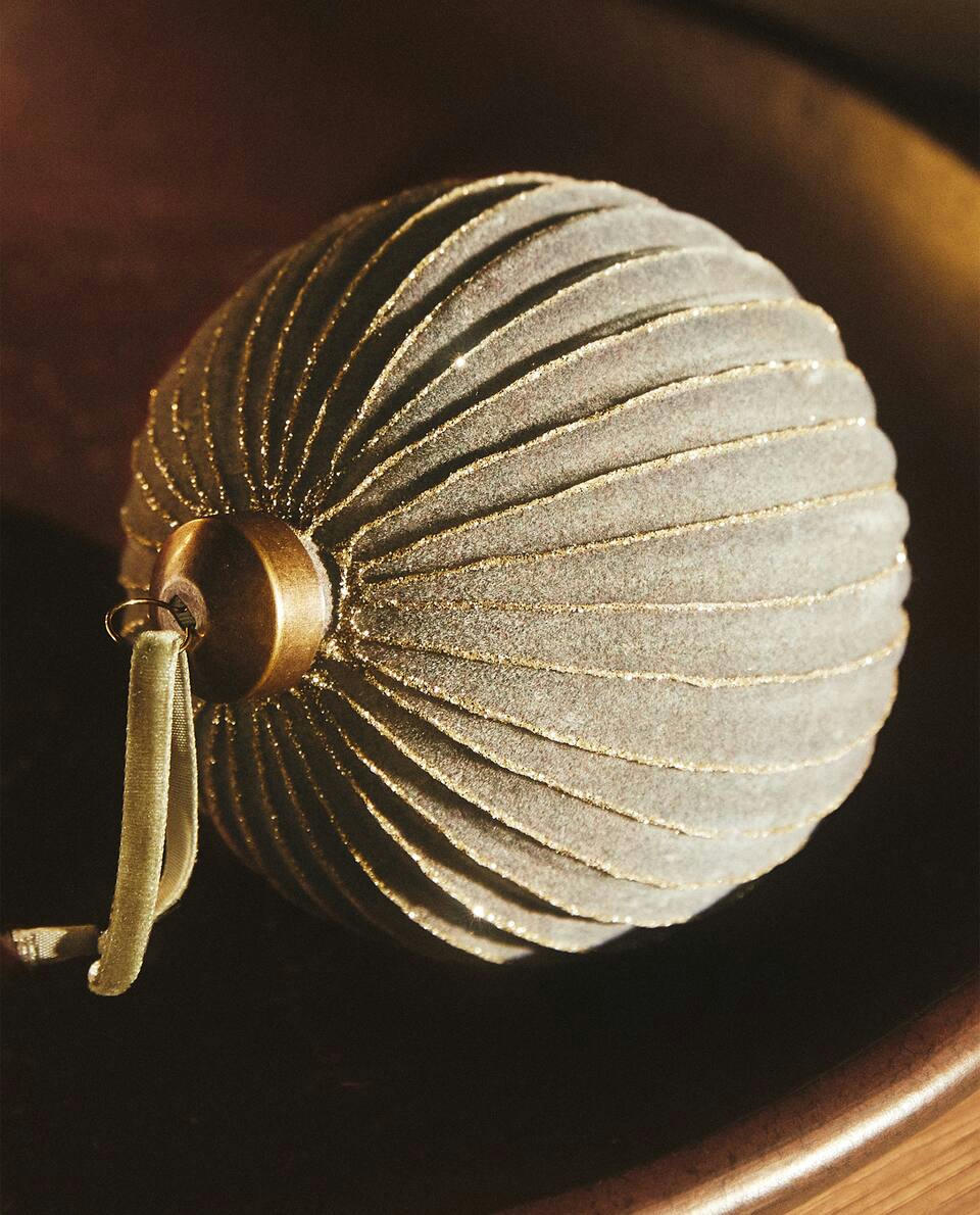 Decorazione per albero di Natale in velluto a forma di pallina con trama a righe verticali, glitter e nastro di velluto per appenderla.