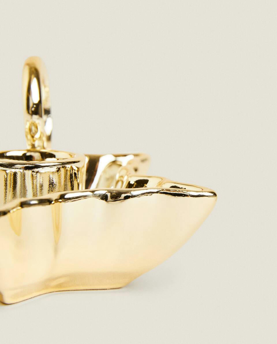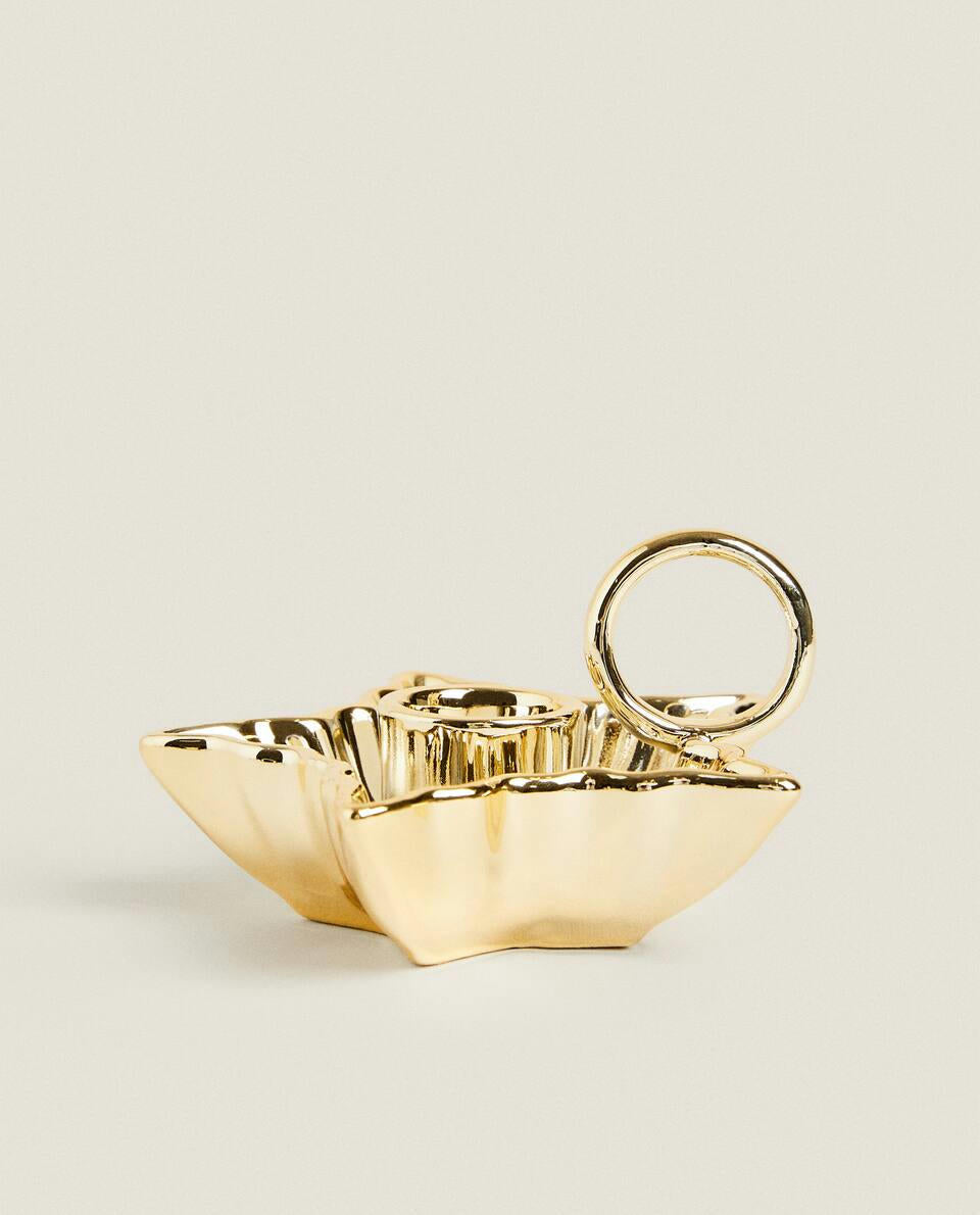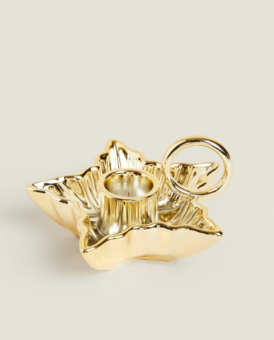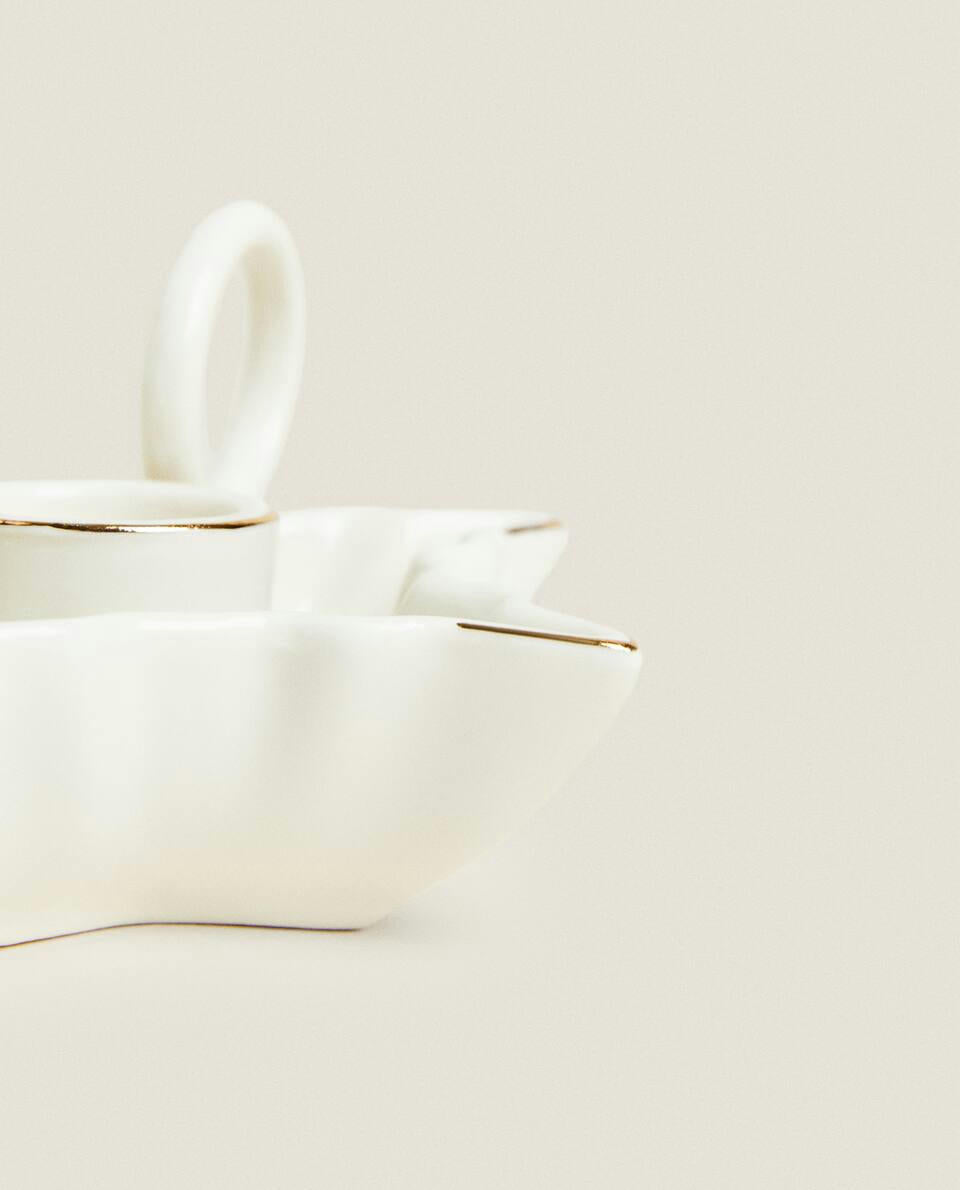 Candeliere in porcellana con manico, caratterizzato da una base a forma di stella con bordo dorato, per Natale.