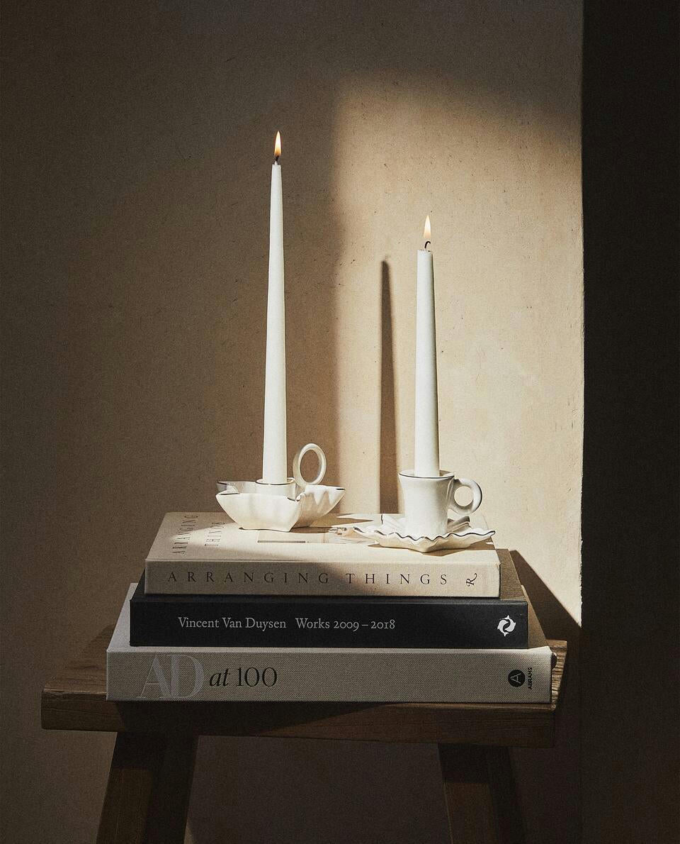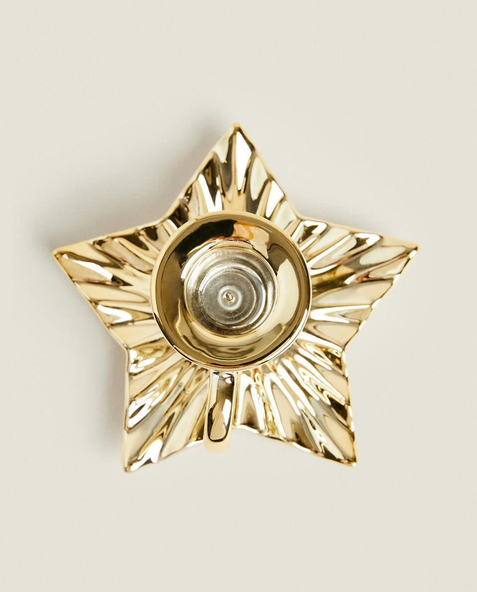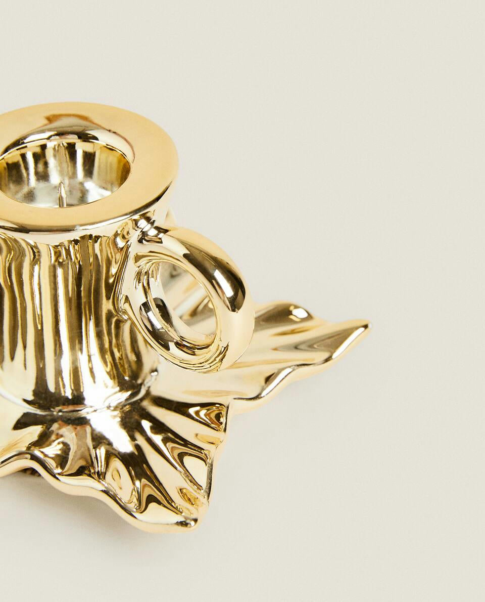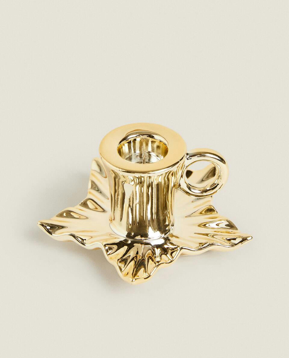 Candeliere in porcellana con manico, caratterizzato da una base a forma di foglia con bordo dorato, per Natale.