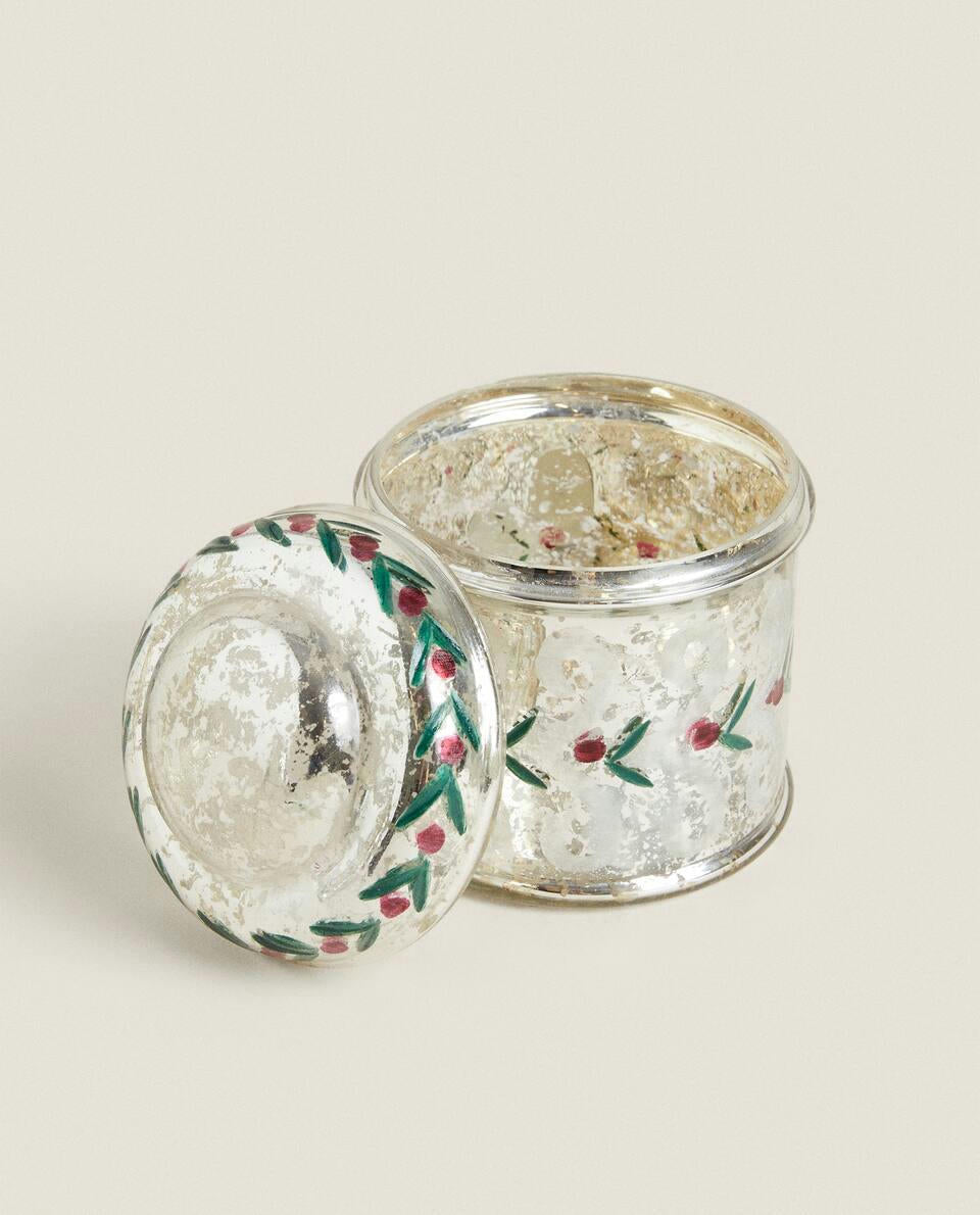 Scatola rotonda in vetro mercurizzato con motivi natalizi.