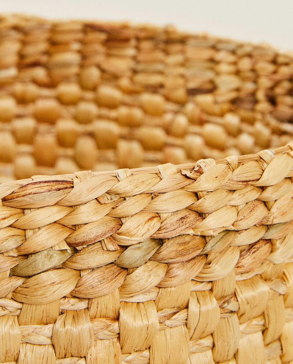 Cestino con base rotonda e finitura bianca con strisce a contrasto.